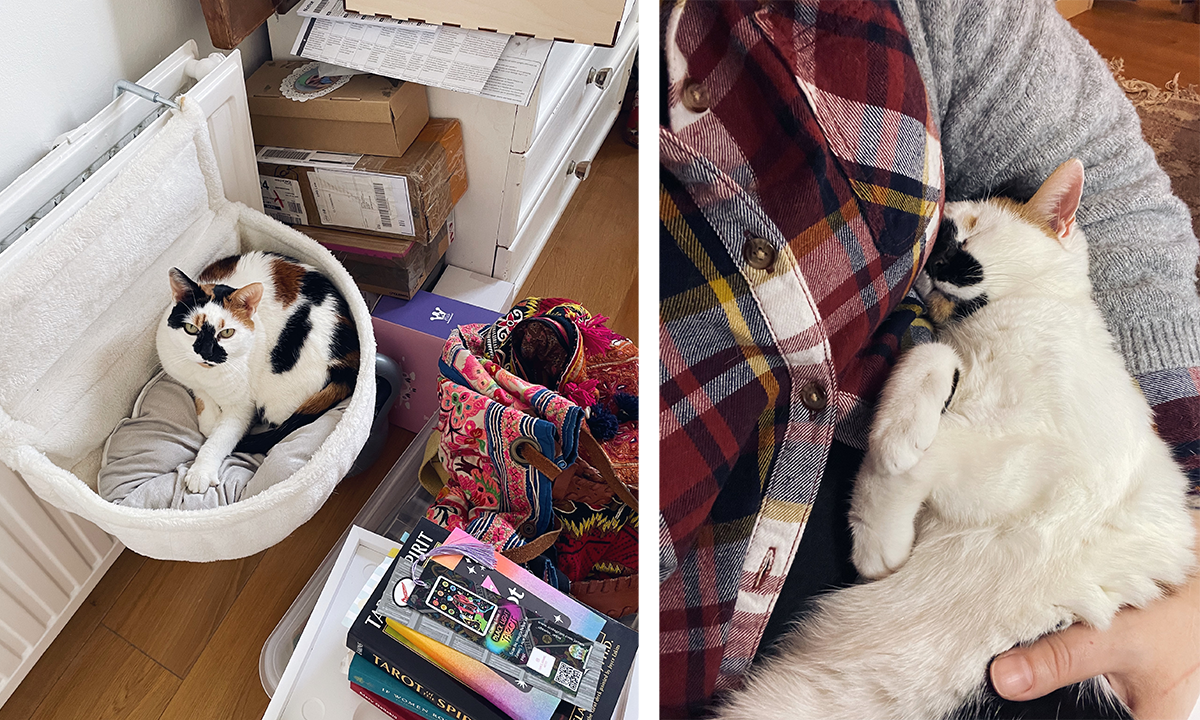 I hear a clunk and a meow — Baba is back inside through the cat flap. I give her breakfast which she may or may not eat — she’s more of a night-time eater — and then, finally, it’s my turn for breakfast. While I eat my eggs my girl takes herself upstairs to find a spot to snooze. Right now the radiator bed in the box room is her favourite. She’ll sleep in there till lunchtime then come find me at my desk for another cuddle.